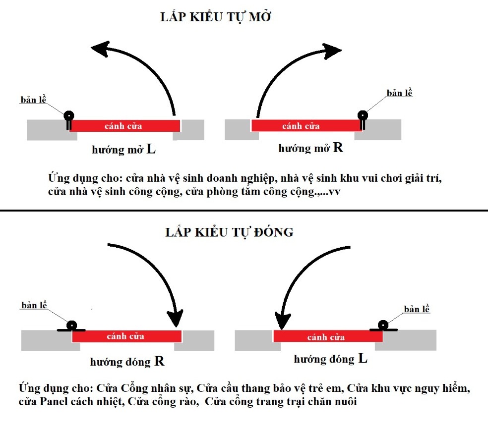 - KIỂU LẮP TỰ ĐÓNG: Cửa luôn tự đóng lại sau khi mở cửa nhằm Giữ nhiệt/ tránh khói / tránh mùi lan tỏa, tránh cháy lan, chống ồn, tránh côn trùng...vv